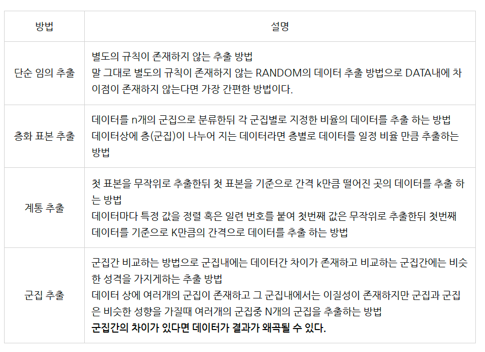 그러한 이유로 여러가지 표본들을 추출하여 모집단의 평균과 표준편차 등등을 추정하게 되는데 이때. 모집단에서 데이터를 가져오는 방법을 표본 추출 이라고 하고 단순 임의 추출, 층화 표본 추출, 계통 추출, 군집 추출등 이 있다.