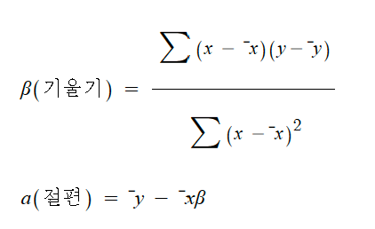기울기를 위와 같은 공식으로 구한뒤 y,x의 평균 값에 기울기를 대입하였을때 부족한 값을 추가 해주는게 절편이다.