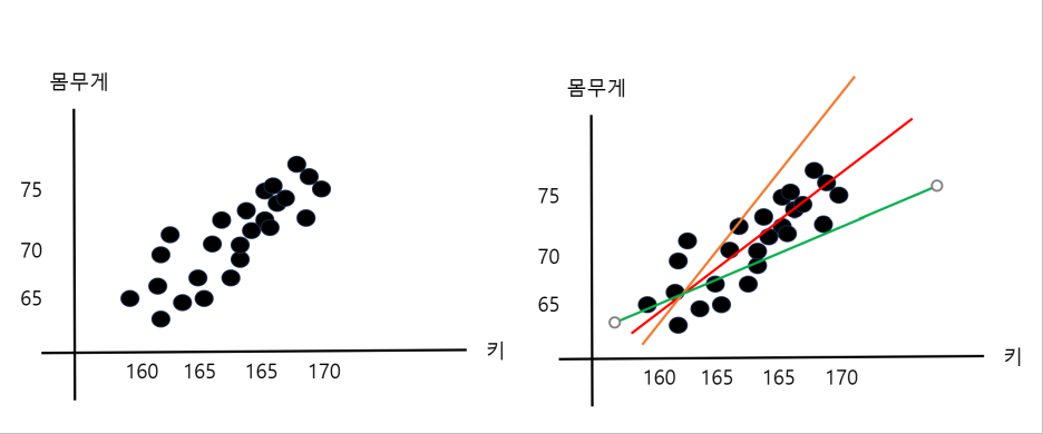 우리가 키와 몸무게에 대한 데이터를 위의 왼쪽과 같은 그래프로 그렸다고 가정 해보자.