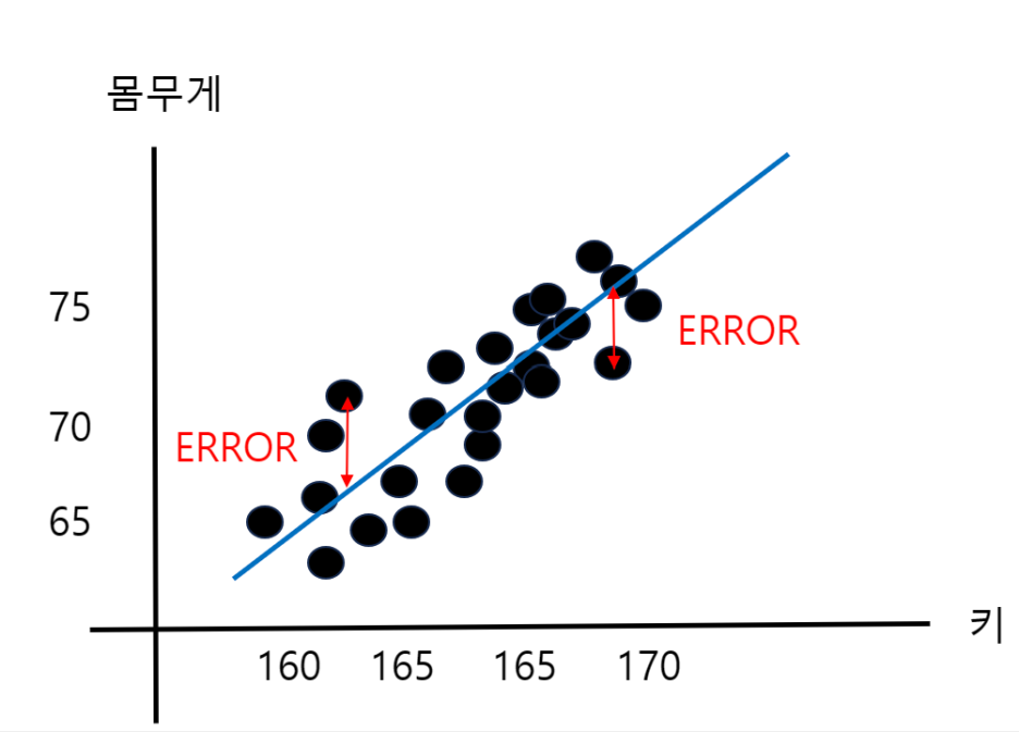 이 선을 그렸을때 실제 X에 대한 Y값과 우리가 그린 선의 차이를 오차(ERROR)라고 한다.