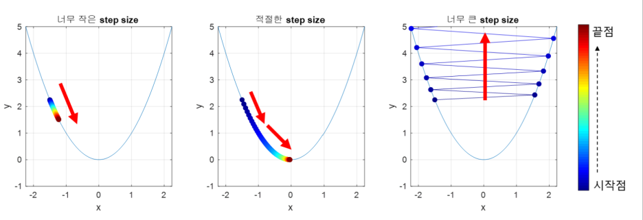 반대로 너무 큰 값으로 바뀌게 된다면 오른쪽 그림처럼 최적의 점을 뛰어 넘고 발산하게 되는 일이 생길 수도 있다.