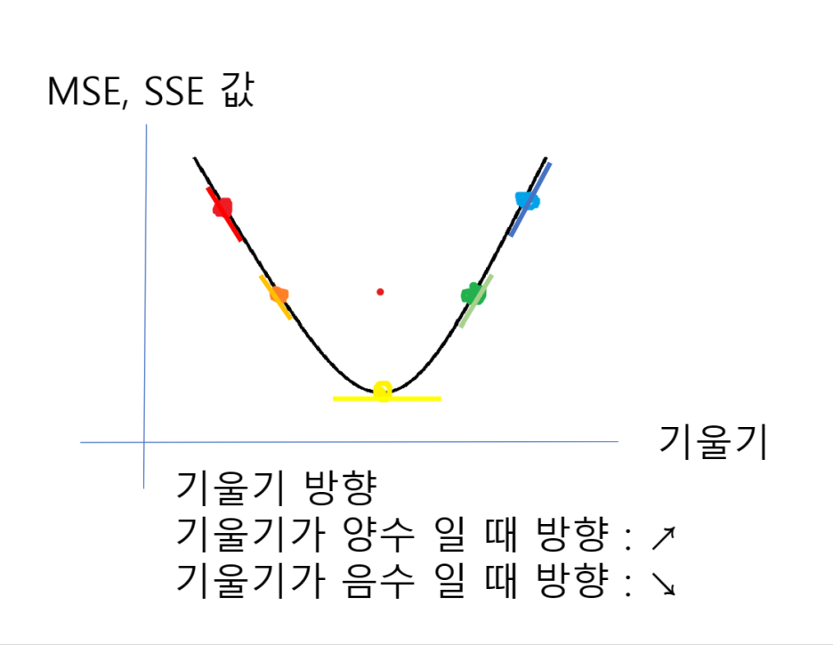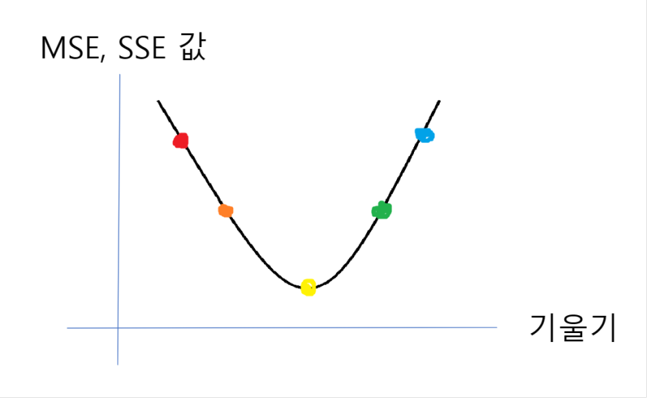 빨간색 ~ 파란색 선 까지 기울기값이 일정하게 차이가 난다고 하였을때 이전에 배웠던 MSE, SSE를 각각의 선에 대입을 하면 오차 제곱의 합은 아래의 그래프같은 모양을 그리게 될 것이다.