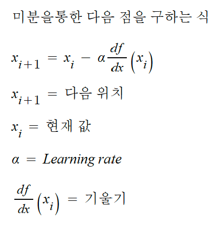 식을 보면 다음 위치 = 현재 값에서 미분을 통한 기울기 값만큼 빼주는 것을 알 수 있다.