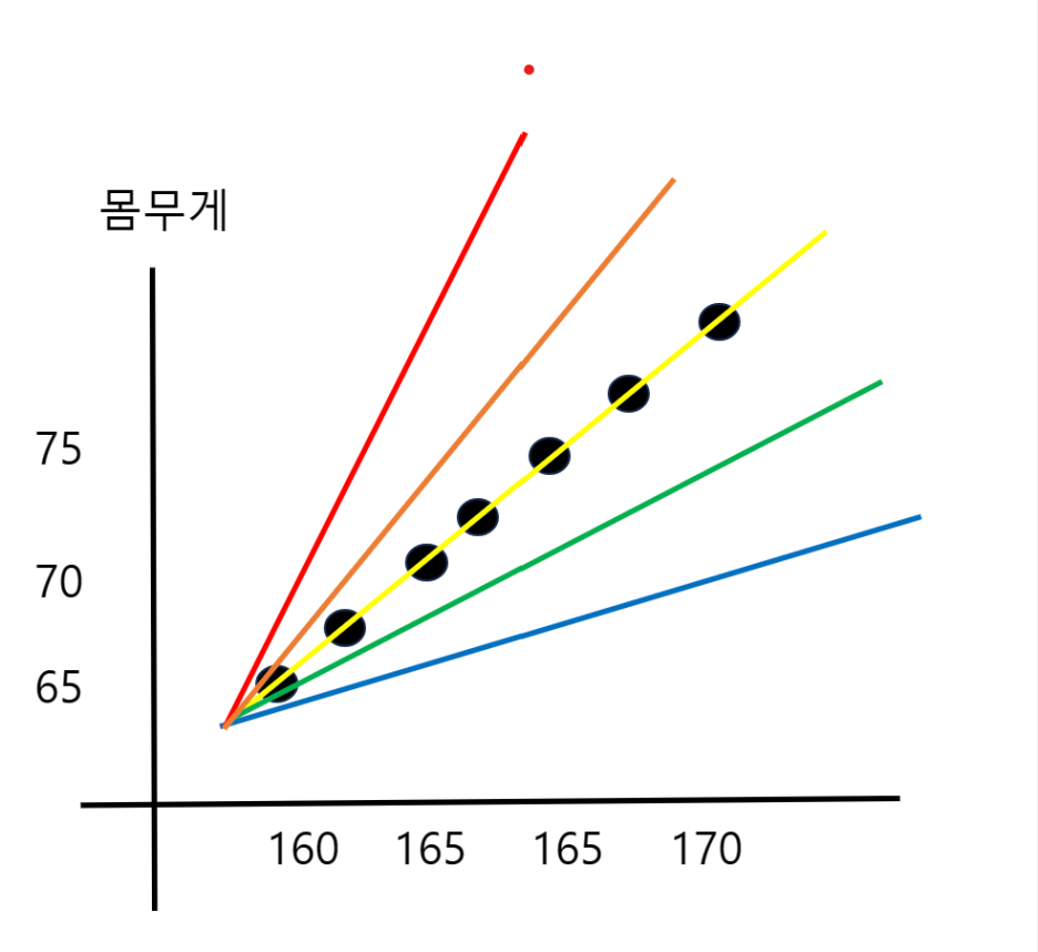 위의 모델에서 가장 회귀분석모델로 적합한 선은 노란색 선이라고 볼 수 있다.(x가 증가할때 y를 잘 따라가기 때문)