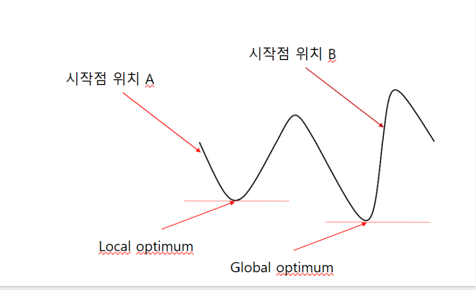 경사하강법의 Local optimum(지역 최적점)을 찾게 되는 흐름