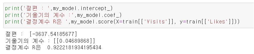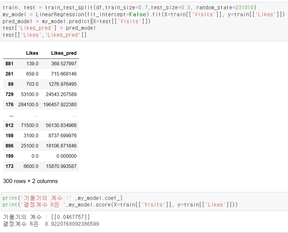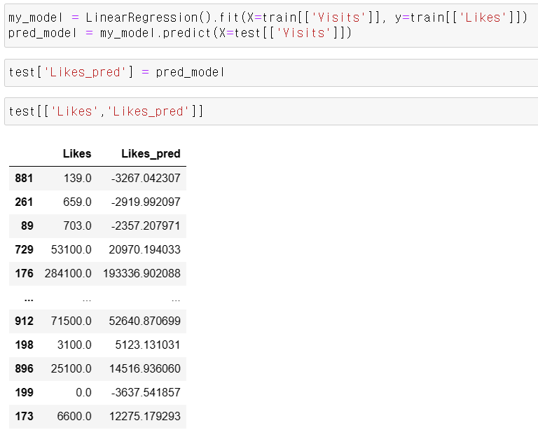 그 후 my_model을 통하여 test data 의 Visits을 넣어 test 의 Likes를 예측한 값을 pred_model에 넣었다고 볼 수 있다.