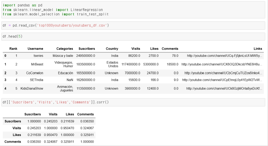 유튜버 top 1000명에 대한 구독, 좋아요, 알람, 댓글 수의 데이터를 가지고 있을때 이들의 상관 관계는 위 그림과 같이 나타 났고, 그중 Likes, Visits 가 강한 상관 관계가 있어 선형 회귀 모델을 만들어 이들을 예측 해보고자 하였다.