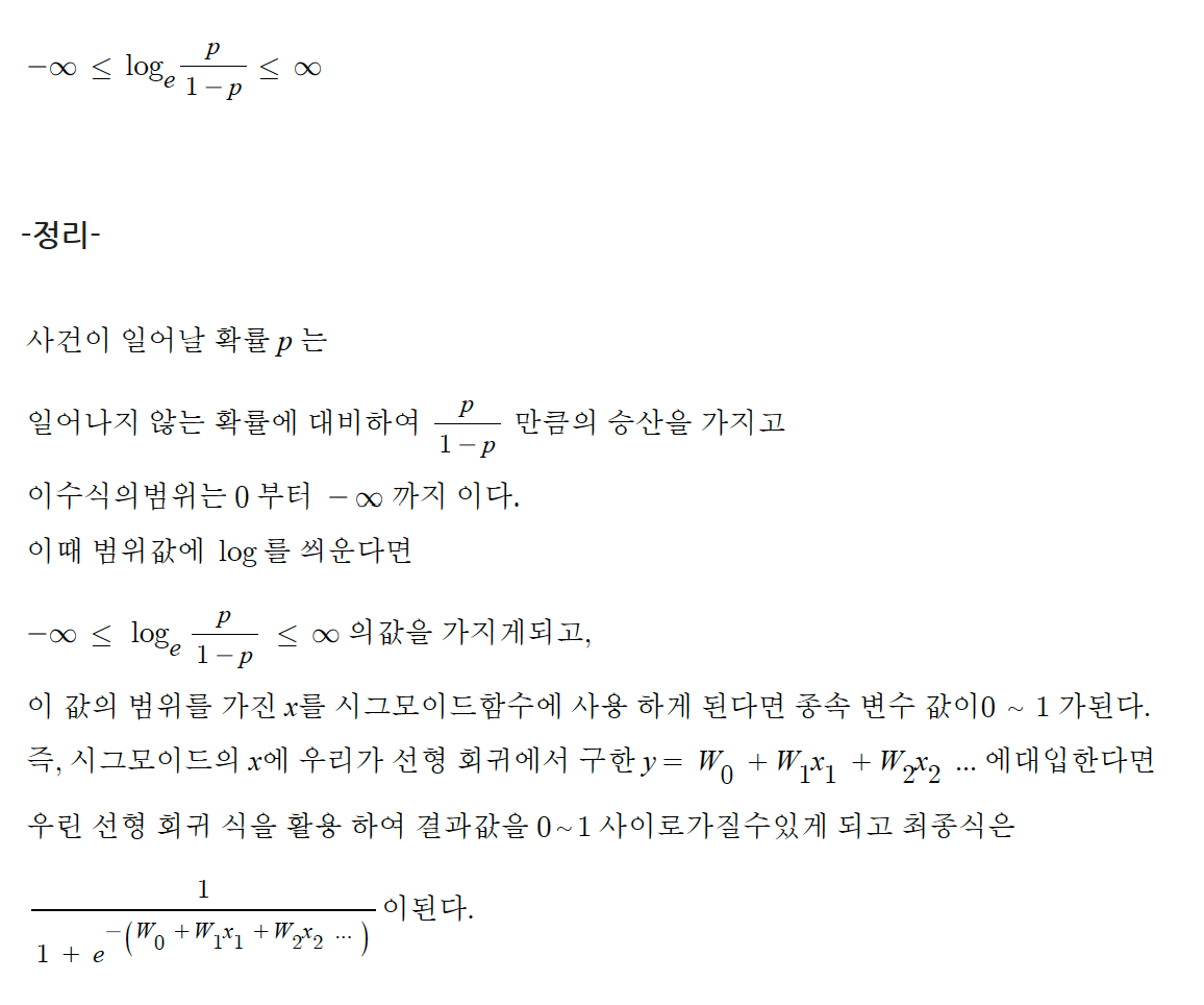즉 승산에 log를 씌우게 된다면 우리는 종속변수의 범위를 - ∞ ~ ∞ 으로 가질 수 있게 할수 있다.