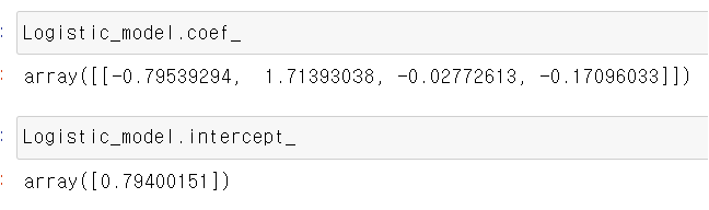 순서는 0, 1의 순서이고 List안에 [ 종속변수가 0일 승산, 종속변수가 1일 승산] 이 적혀있다.