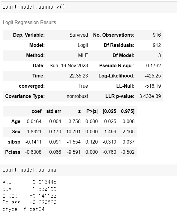 이후 독립변수의 회귀 계수 및 절편을 알고 싶으면 OLS와 동일하게 params 혹은 summary를 통해 알 수 있다.