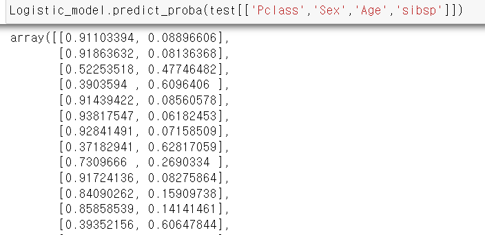 각 변수별 종속변수의 승산을 알고 싶다면, predict_proba를 활용하여 확인 할 수 있다.