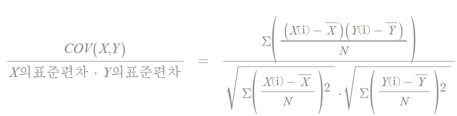 이때 우리는 변수X와 Y 각각의 표준편차를 곱한뒤에 분자에 나누어 주게 된다.